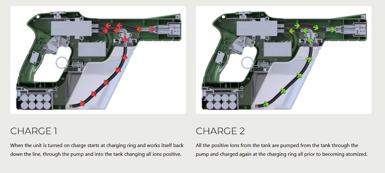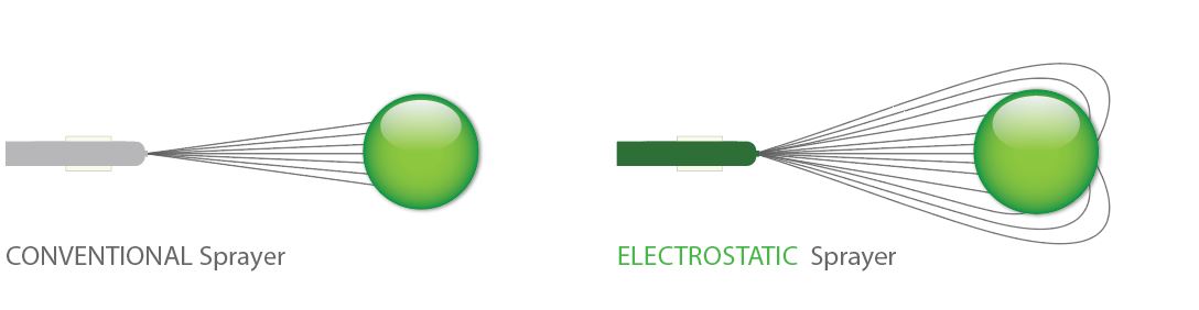 “E-Sprayers” have developed patented cordless application technology that places a positive charge on the liquid before entering the nozzle. This charged solution binds to negatively charged surfaces (most surfaces are either negative or neutral) providing complete coverage.