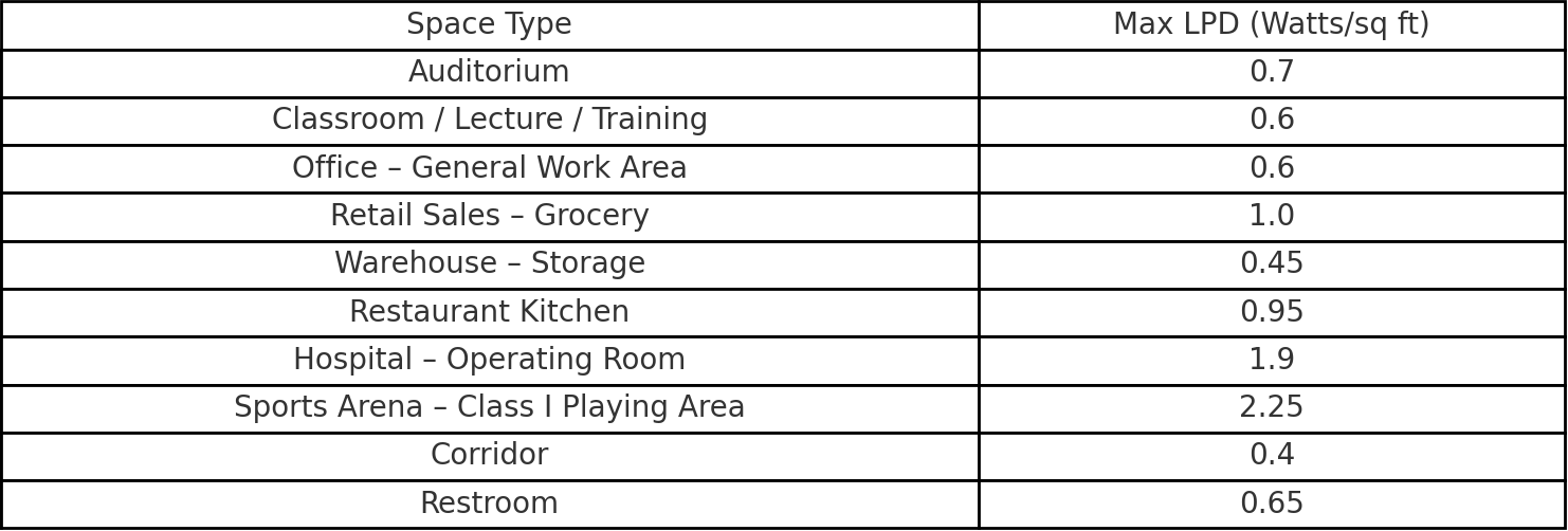 Sample LPD Limits (Watts/sq ft) based on the Area Category Method