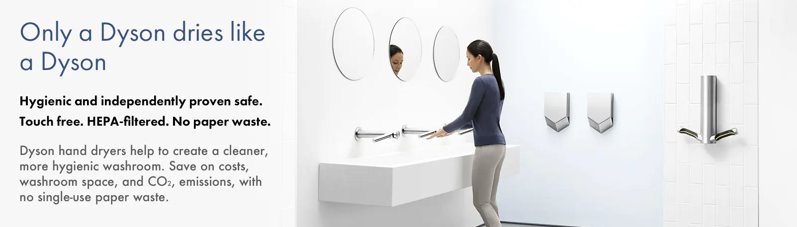 Only a Dyson dries like a Dyson Hygienic and independently proven safe. Touch free. HEPA-filtered. No paper waste. Dyson hand dryers help to create a cleaner, more hygienic washroom. Save on costs, washroom space, and CO2, emissions, with no single-use paper waste. |