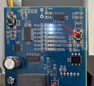 - Release the button. The unit will reinitialize to the correct voltage, and the lights on the circuit board will blink 3 times.